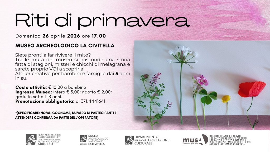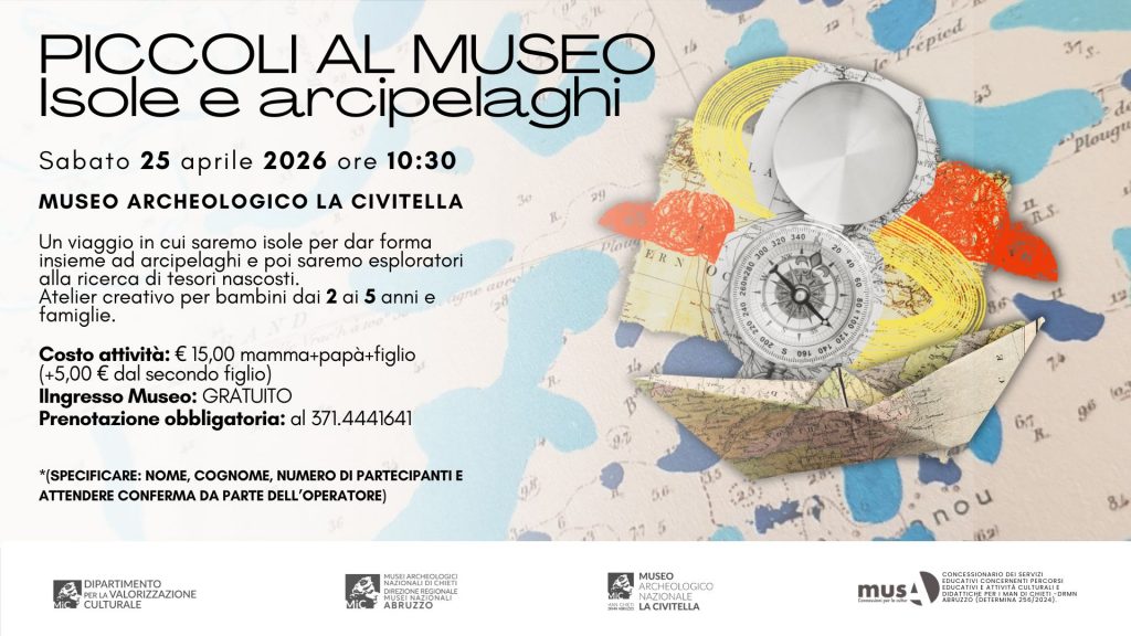 I Musei archeologici nazionali di Chieti – Direzione regionale musei nazionali dell’Abruzzo aprono le porte a un fine settimana dedicato alla creatività e alla scoperta. Sabato 25 e domenica 26 aprile 2026, il Museo “La Civitella” e il Museo “Villa Frigerj” ospiteranno una serie di atelier didattici pensati per coinvolgere bambini e famiglie nella storia del territorio.