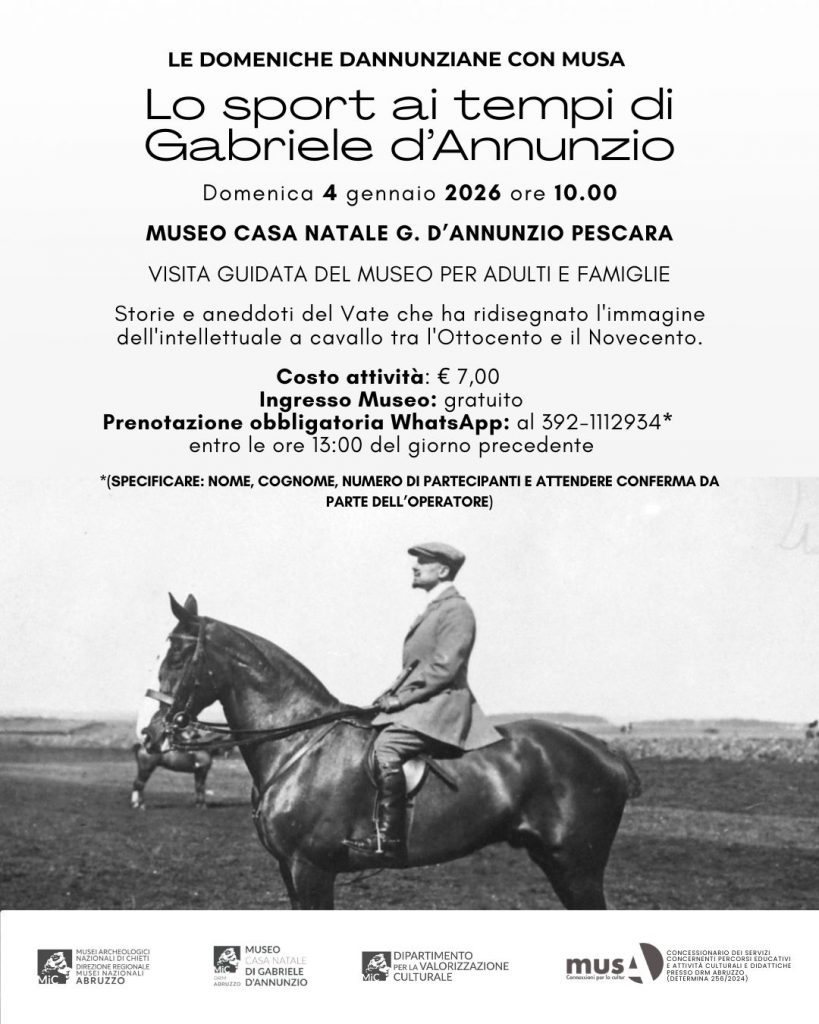 - Domenica 4 gennaio – ore 10:00/11:30 Lo sport ai tempi di Gabriele d’Annunzio. Visita guidata tematica del museo (per adulti e famiglie). Storie e aneddoti del Vate che ha ridisegnato l’immagine dell’intellettuale a cavallo tra l’Ottocento e il Novecento. Costo attività € 7,00 a persona, gratuito per i bambini. Ingresso al museo gratuito. Prenotazione obbligatoria al n. 3921112934 entro le ore 13:00 del giorno precedente (*specificare nome, cognome, n. partecipanti e attendere conferma) (a cura dei concessionari dei Servizi Educativi – musA)