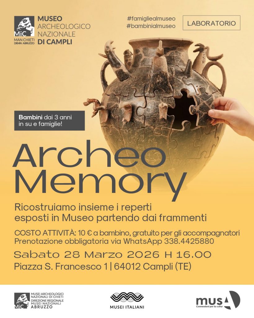 Sapevate che un piccolo frammento può raccontare storie millenarie? Il Museo Archeologico Nazionale di Campli presenta “Archeomemory”, un laboratorio dedicato ai bambini e alle loro famiglie. I partecipanti potranno sperimentare la ricostruzione degli oggetti partendo proprio dai reperti esposti, imparando il delicato lavoro dell’archeologo. Al termine dell’attività, ogni bambino potrà realizzare un personalissimo “gioco della memoria” a tema da portare a casa.
