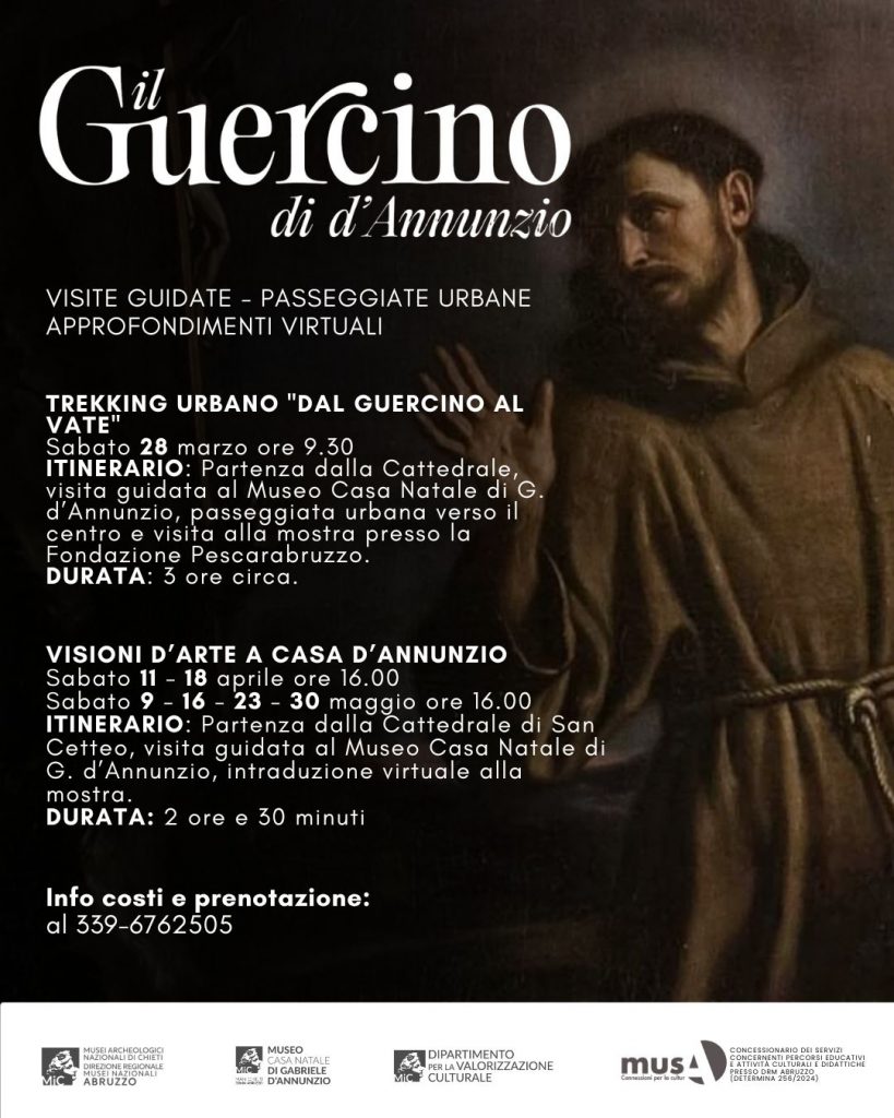 Per chi ama camminare e scoprire i segreti della città, il Museo Casa Natale di Gabriele d’Annunzio propone il trekking urbano “Dal Guercino al Vate”. Un percorso di circa 3 ore che collega la Pescara storica a quella moderna, svelando perché il capolavoro del Guercino, il “San Francesco che riceve le stimmate”, sia conservato proprio nella Cattedrale di San Cetteo. L’itinerario comprende la visita alla Casa Natale del Vate e una passeggiata verso il centro per visitare la mostra presso la Fondazione Pescara Abruzzo.